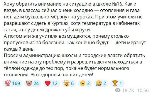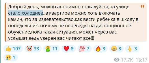 Полторы недели тем временем уже прошли. И в реальности изменения в Приднестровье, вопреки слова Оболоника, заметили очень быстро. При просмотре местных пабликов и общении с жителями региона явно улавливаются беспокойство и фрустрация. Спустя 10 дней экономии родители жалуются на то, что дети мёрзнут в не отапливаемых школах и детских садах. Необходимость греть воду в тазике, чтобы помыться в квартирах без «бойлера», бытовые потребители тоже заметили.