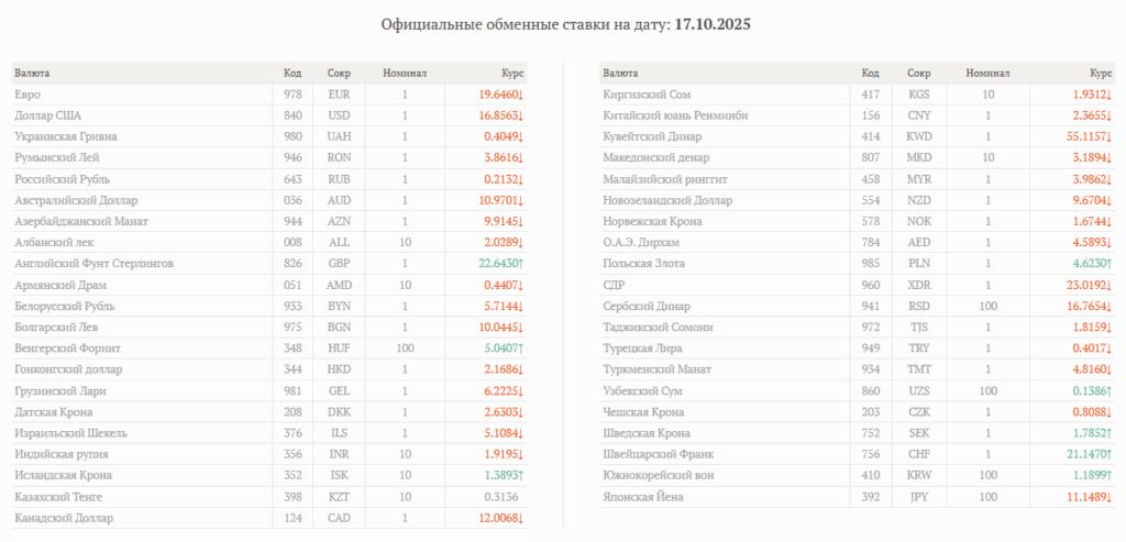 Национальный банк Молдовы представил официальный обменный курс валют на пятницу, 17 сентября и выходные.