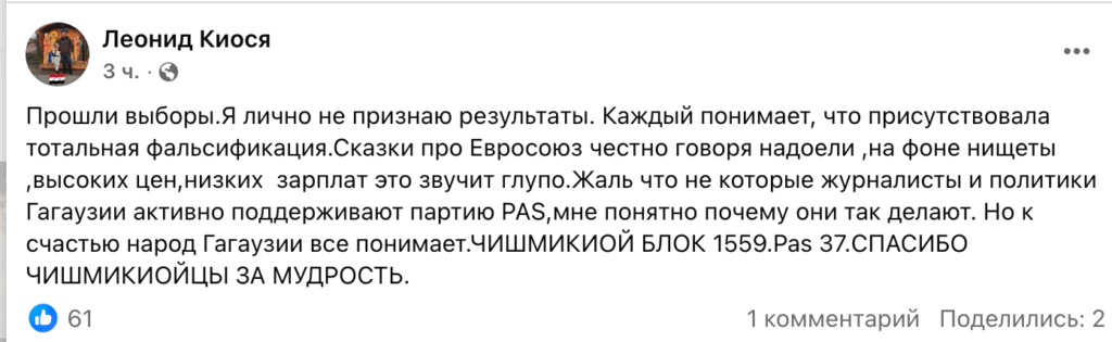 Депутат от социалистов в Народном собрании Леонид Киося заявил в фейсбуке, что результаты выборов не признает, были массовые фальсификации, “сказки о евроинтеграции звучат глупо” и поблагодарил односельчан из Чишмикиойя за голос в пользу “Патриотов”.