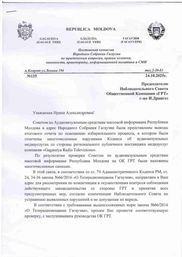 Народное собрание Гагаузии (НСГ) инициировало проверку общественного телеканала GRT после выявленных нарушений. Ранее Совет по телевидению и радио потребовал от НСГ, как учредителя канала, принять меры и прекратить использовать эфир для продвижения политических интересов.