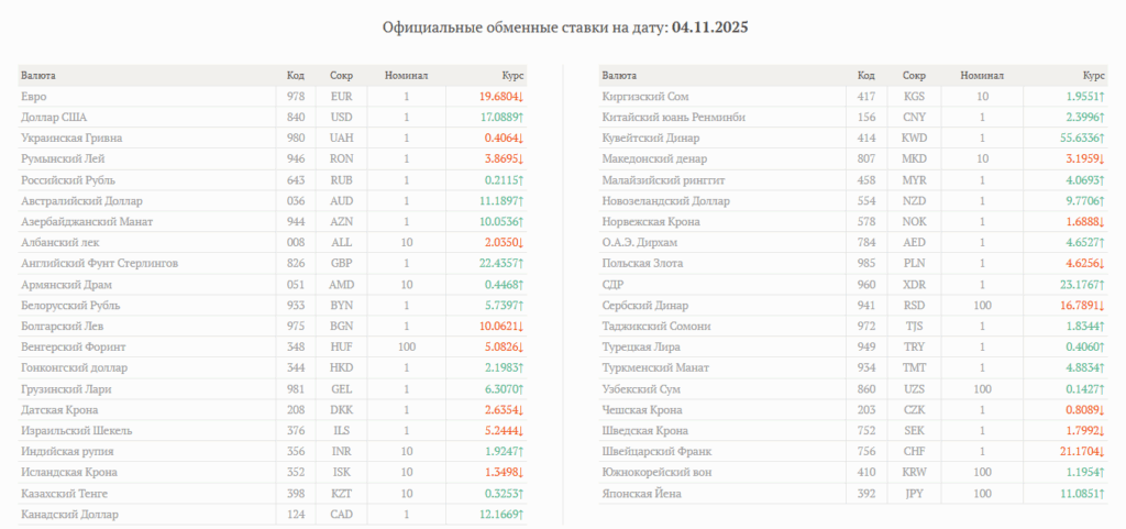 Национальный банк Молдовы представил официальный обменный курс валют на вторник, 4 ноября.