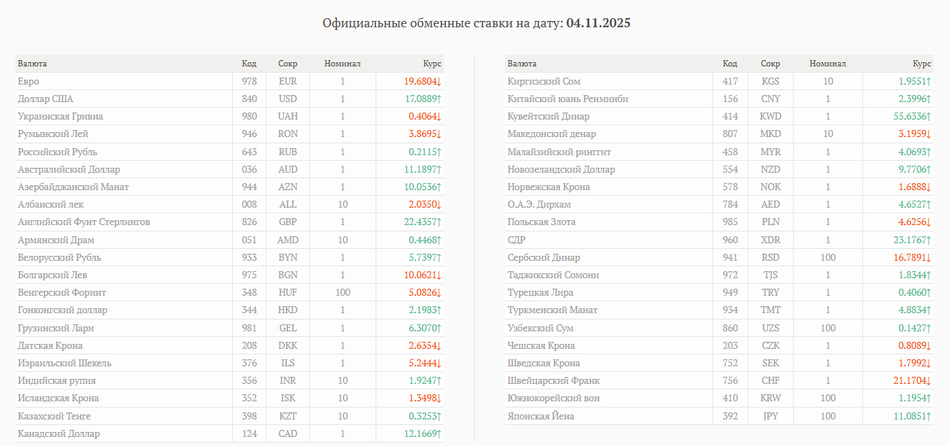 Национальный банк Молдовы представил официальный обменный курс валют на вторник, 4 ноября.