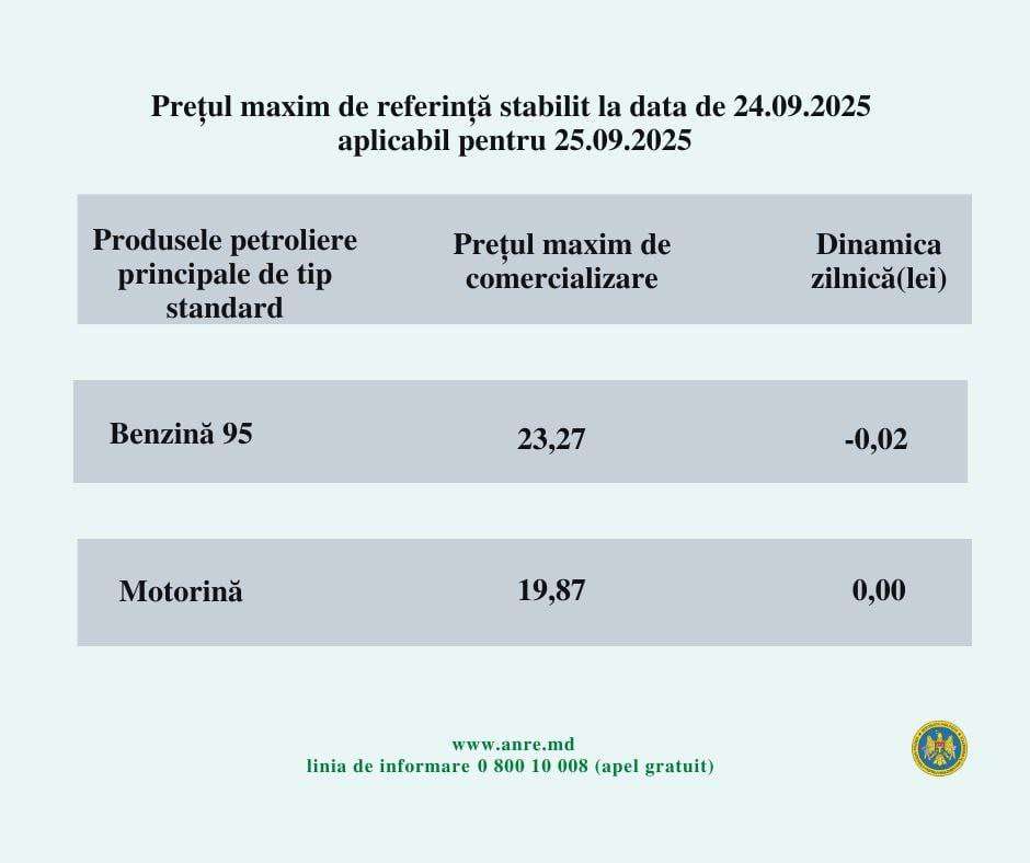 Национальное агентство по регулированию в энергетике (НАРЭ) объявило цены на топливо в Молдове на четверг, 25 сентября.