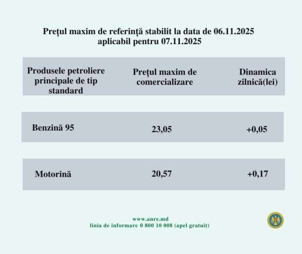 Национальное агентство по регулированию в энергетике (НАРЭ) объявило цены на топливо в Молдове на пятницу, 7 ноября.