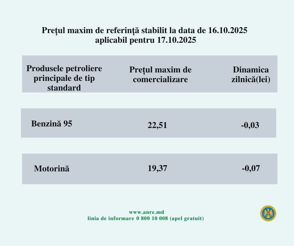 Национальное агентство по регулированию в энергетике (НАРЭ) объявило цены на топливо в Молдове на пятницу, 17 октября