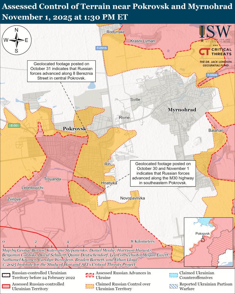 Другой OSINT-проект «Картограф ЗСУ» в субботу со ссылкой на источники в ВСУ сообщил, что российские военные «есть по всему Покровску, а не только где-то на окраинах». По оценке проекта, российская армия контролирует 18,9 кв. км города, а силы ВСУ — 6,1 кв. км. «Таким образом можно сказать, что 79% города находится либо под контролем российских военных, либо в серой зоне», — сообщил проект.