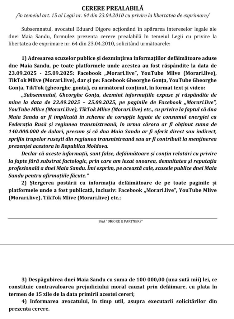 Георге Гонца сообщил, президентка Майя Санду через адвоката направила ему предварительное требование опровергнуть заявления, сделанные им в недавнем видеоролике, удалить его со всех площадок и принести извинения.