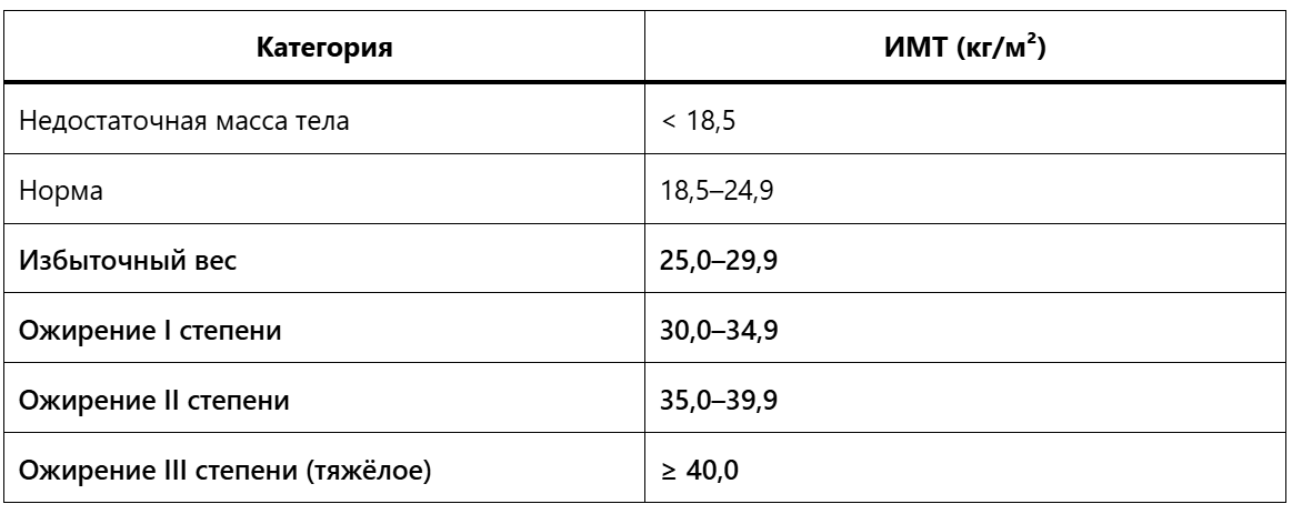 - Избыточный вес начинается при ИМТ ≥ 25.