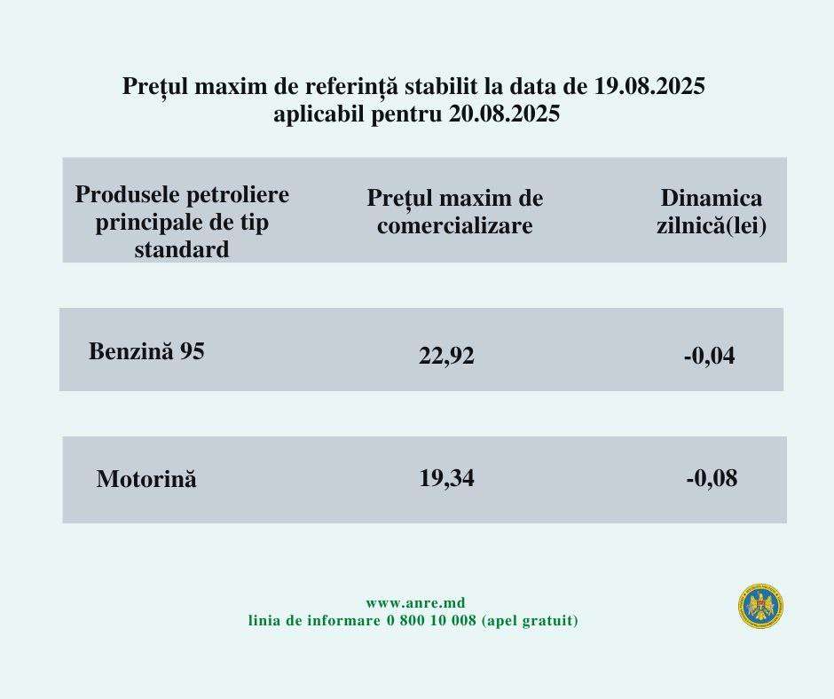 Национальное агентство по регулированию в энергетике (НАРЭ) объявило цены на топливо в Молдове на среду, 20 августа.