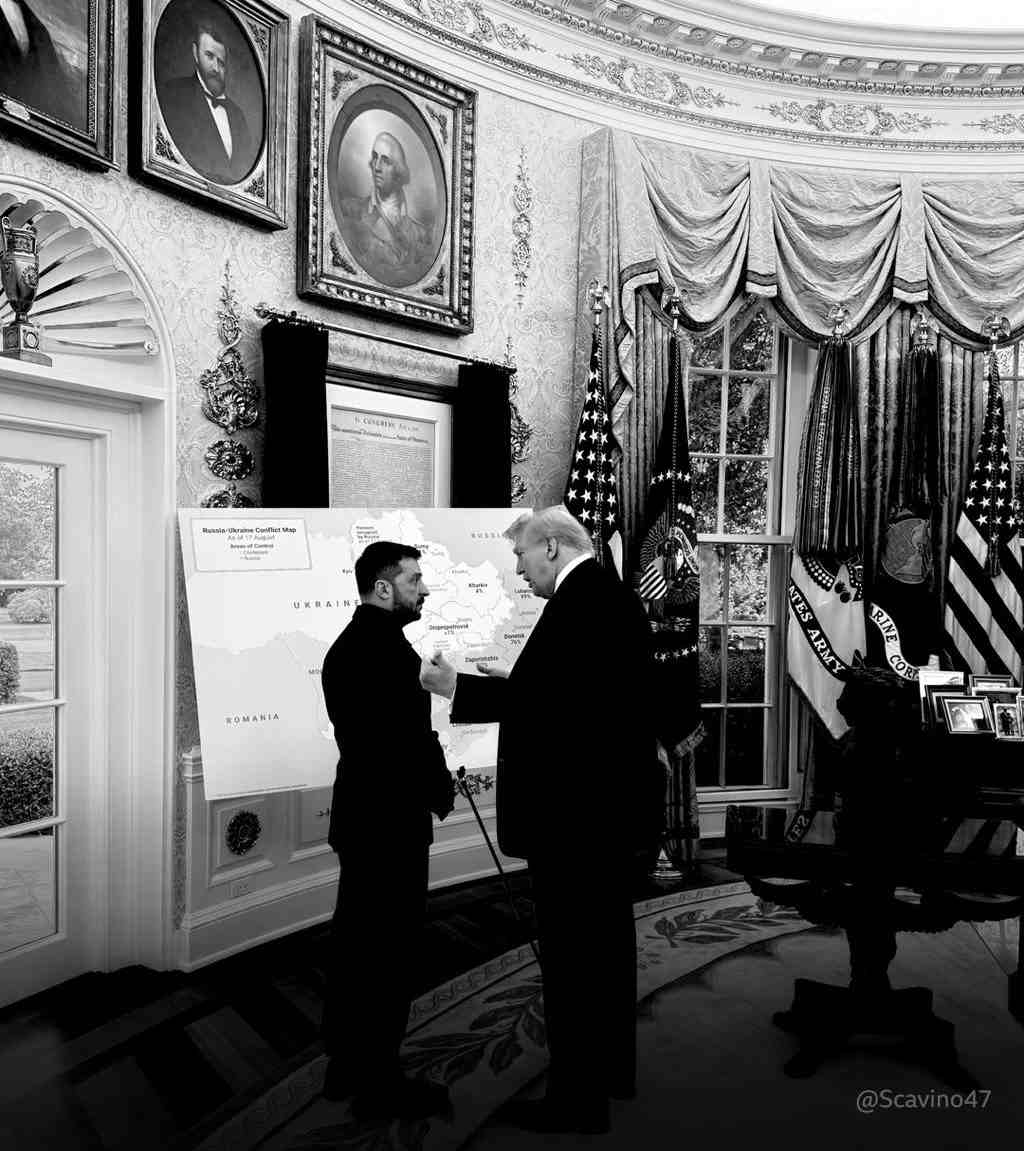 Во время переговоров журналисты обратили внимание на большую карту Украины в Овальном кабинете. Зеленский не скрывает: он понимает, что сегодня не контролирует все территории 1991 года, но не готов признавать юридически принадлежность России территорий, захваченных ею с 2014 года.