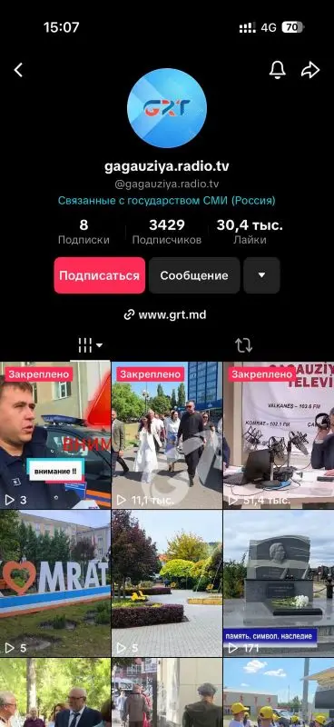 На TikTok-аккаунте и всех видео общественного гагаузского телеканала GRT появилась отметка «Связанное с государством СМИ (Россия)».
