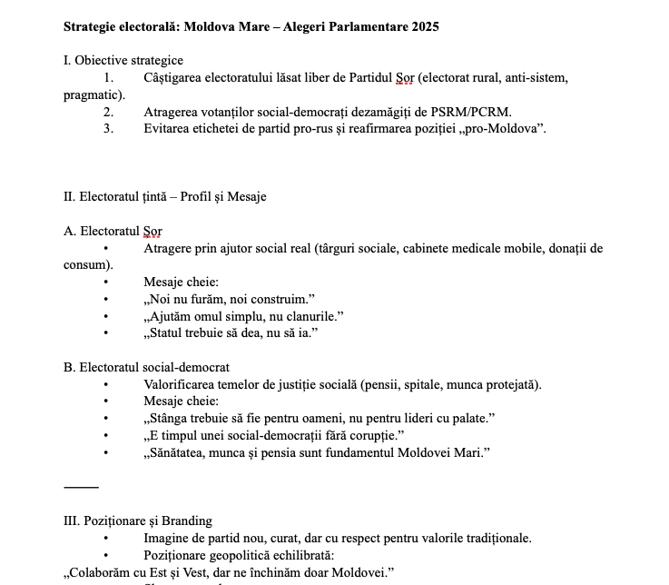 Один из утёкших документов — программа и избирательная стратегия партии Фуртунэ «Великая Молдовы» на парламентских выборах 2025 года. Согласно ему, политикесса надеялась завоевать электорат, оставшийся после исчезновения партии «Шор»: сельских, антисистемных, «прагматичных» избирателей. Другая задача — привлечь разочарованных сторонников ПСРМ и ПКРМ.
