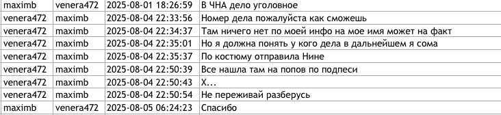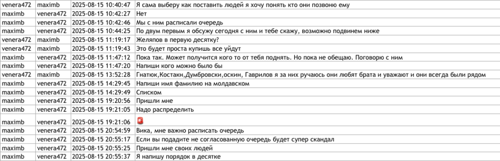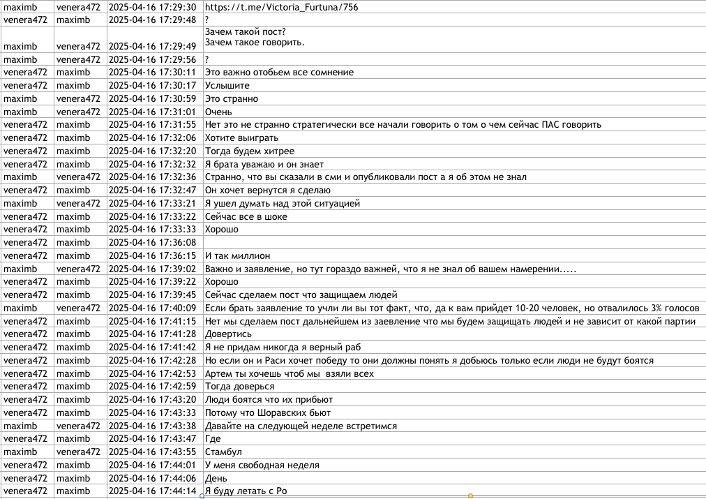 Другой документ, озаглавленный venera472 Victoria Furtună-1, содержит страницу с перепиской, датированной мартом–августом 2025 года. Её, предположительно, вели Фуртунэ под псевдонимом venera472 и Антон Трегуб под псевдонимом maximb. По данным Deschide, Трегуб был одним из российских кураторов Марины Таубер в избирательной кампании на пост мэра Бельц в 2021 году. Он также помогал с логистикой и стратегией шоровской партии «Возрождение» в 2024 году.