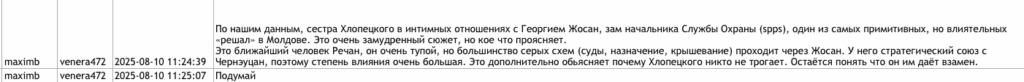 Куратор, как утверждается в утечке, отметил, что «каналами для решения проблем» могут быть член Высшего совета магистратуры Ливия Митрофан и бывший комиссар полиции Буюкан Лилиан Паскару. Напомним, что после приговора Гуцул член ВСМ Ливия Митрофан сообщала, что ей угрожали, как и Анне Кучереску. В 2024 году она утвердила состав специализированных антикоррупционных коллегий.