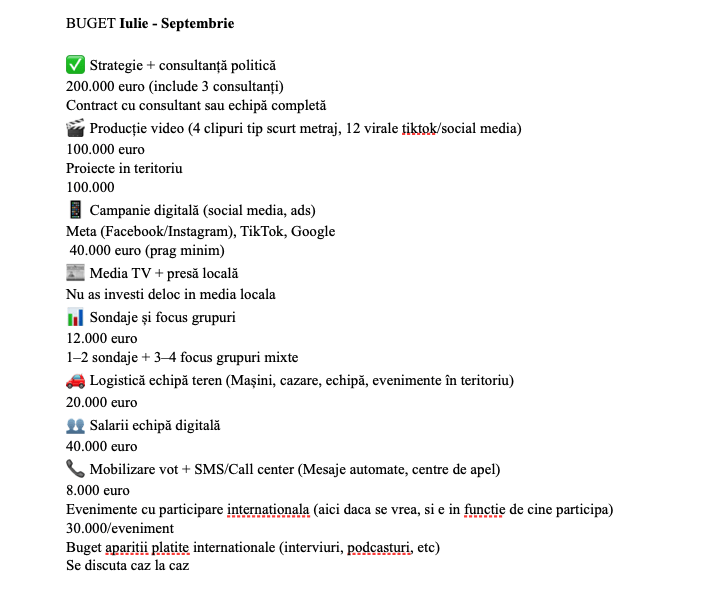 Лейтмотив переписки — постоянные просьбы о финансировании со стороны Фуртунэ. В утечке есть и отдельный документ — первоначальный бюджет партии Фуртунэ, согласно которому с июля по сентябрь «Великая Молдова» запрашивала из России 550 тысяч евро.