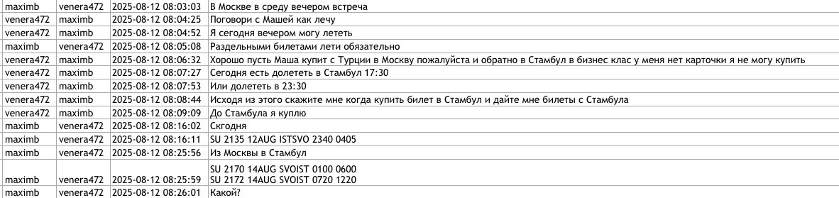 Согласно утечке, Фуртунэ несколько раз летала в РФ и ОАЭ на российские средства. В переписке, предположительно, Фуртунэ запрашивает деньги на перелёты. Среди попавших в Сеть материалов — авиабилеты, купленные через агентство в Москве. Куратор якобы уведомлял Фуртунэ, что 13 августа ей предстоит лететь в Москву для участия в дискуссиях, а 14 августа она должна вернуться в страну. Полёт проходил с пересадкой через Стамбул.