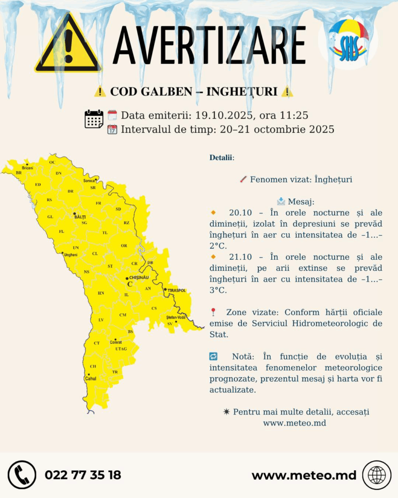 Ночью и утром 20 октября ожидаются заморозки от –1 до –2°C. 21 октября, также ночью и утром, температура опустится до промежутка от –1 до –3°C. Жёлтый код действует на всей территории Молдовы. Метеорологи будут обновлять карту заморозков, в зависимости от погодных изменений.
